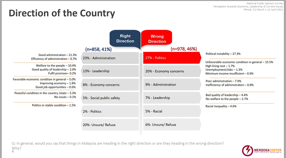 今年四月,默迪卡民調中心(Merdeka Center)的最新民調顯示(下圖),目前國人最關心的重大課題是首先經濟(57.0%),其次為疫情(15.7%),才輪到政治(2.4%)。可見,部份人物的所作所為,似乎與社會現實脫節。問及國家是否朝向正確發展方向時,持反對意見的受訪者認為主因是政治不穩定(27%)。